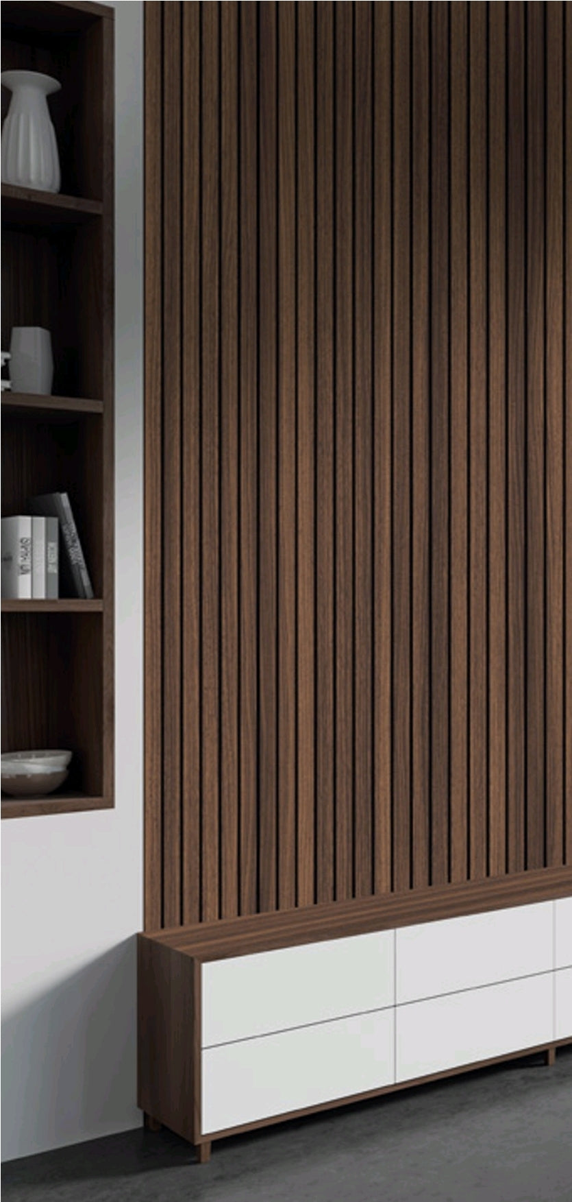 Il retro dei pannelli presenta un feltro in poliestere che assorbe efficacemente il suono mentre la parte a vista dei pannelli è in laminatino .